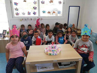 Primer, hem pogut decorar la nostra corona amb ajuda dels amics amb qui solem tenir més afinitat.A continuació, tots junts hem cantat les cançons d'aniversari en vàrios idiomes com sempre ens agrada fer amb la tarta tan especial que tenim enguany. I per últim, una de les parts que més els hi agrada; fer el dibuix-regal que desprès es podrán dur a casa en forma de llibret!! Com sabeu, és una ocasió especial per treballar també la escriptura del nos dels companys en un context totalment significatiu!